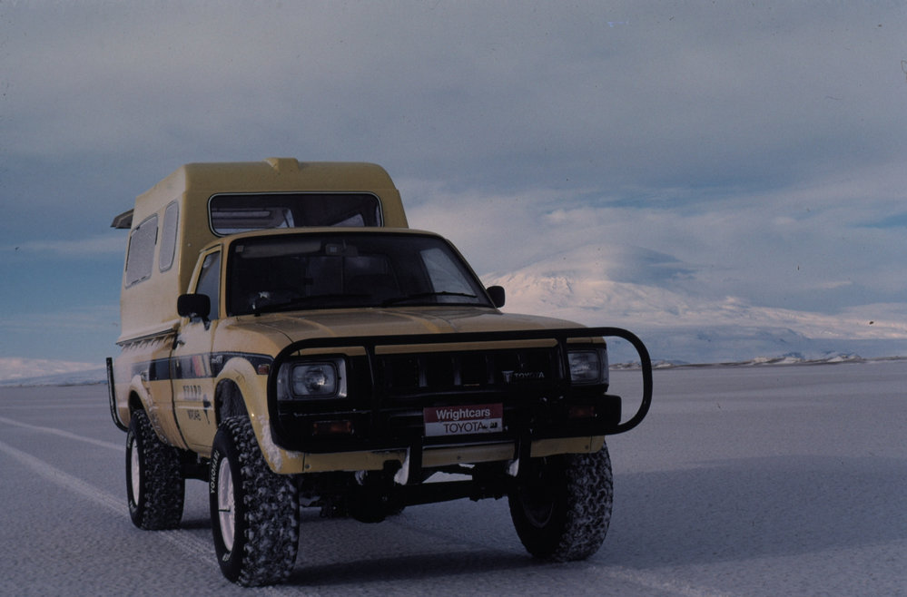 DescriptionNZARP Toyota Hilux at CIROS (Cenozoic Investigation in the Western Ross Sea) Drill SitePhotographerAlison WelchSeason1984-1985Date Taken1984-1985 SeasonOriginalSlideLocationMcMurdo SoundGeolocation[1] Position