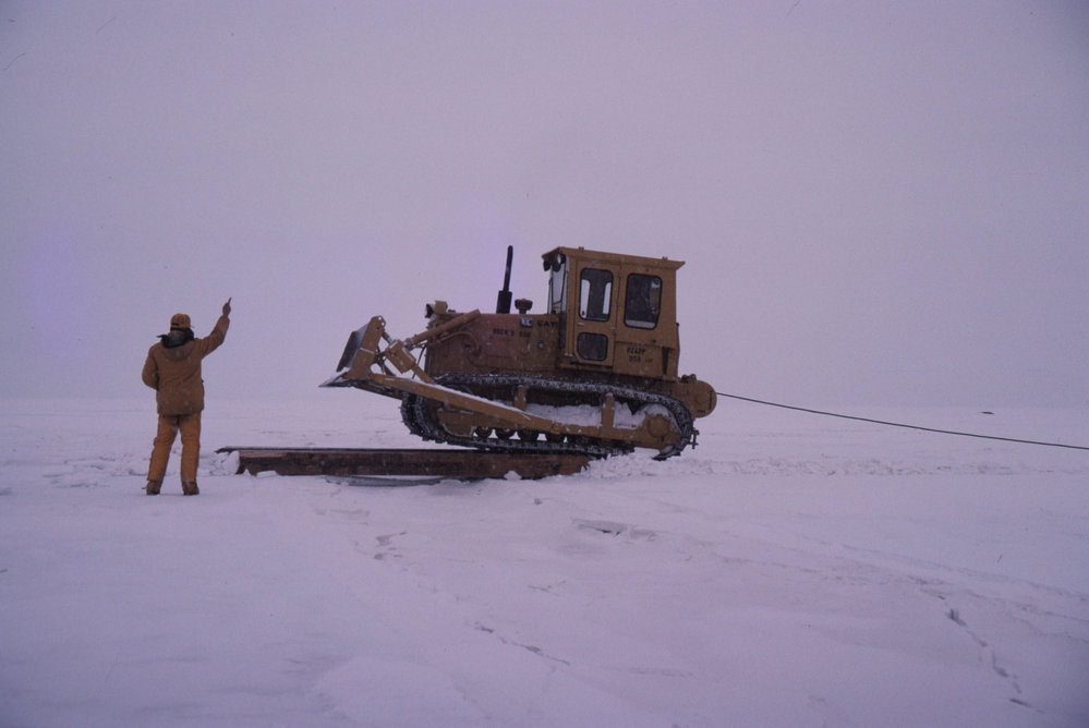 D5 Tractor Crossing Crack Using Bridge, Cargo Train near Strand Moraines.