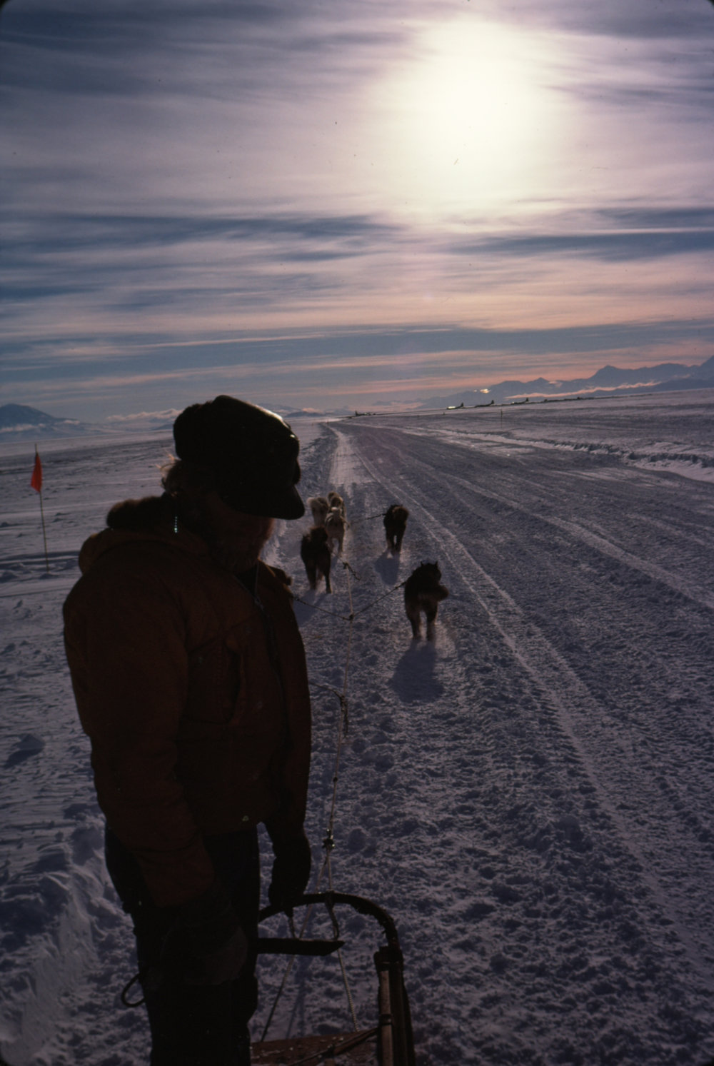 DescriptionDogs on Snow Road in Midnight SunPhotographerM BradstockSeason1977-1978Date TakenBetween 1st December 1977 and 31st December 1977OriginalSlideNo. People1