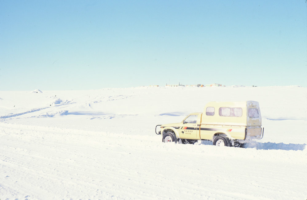 DescriptionToyota on the sea ice by the Butter Point campPhotographerP J BarrettSeason1984-1985Date Taken1984-1985 SeasonOriginalSlideLocationButter PointGeolocation[1] Position
