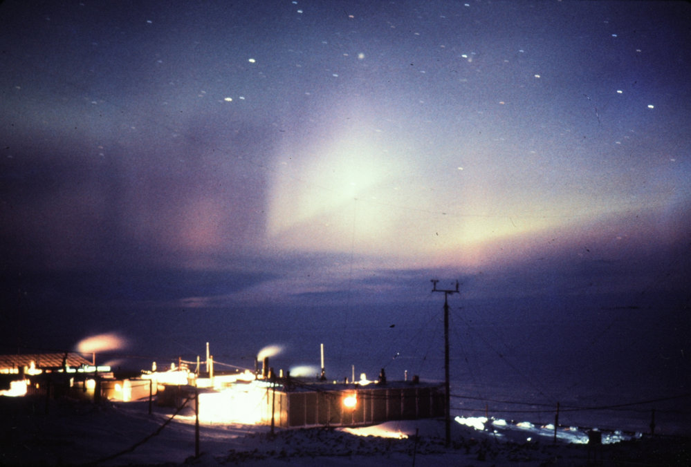 DescriptionAurora over Scott BaseSeason1975-1976Date TakenBetween 1st June 1976 and 30th June 1976OriginalSlideLocationScott BaseGeolocation[1] Position