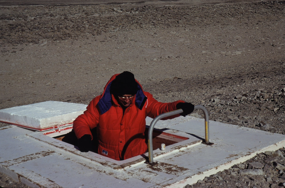 Barry Brill, Parliamentary Under-Secretary to the Minister of Energy, Science and Technology, exploring the food storage cave at Vanda Station. Antarctica NZ, accessed 04/04/2026, https://adam.antarcticanz.govt.nz/nodes/view/24148