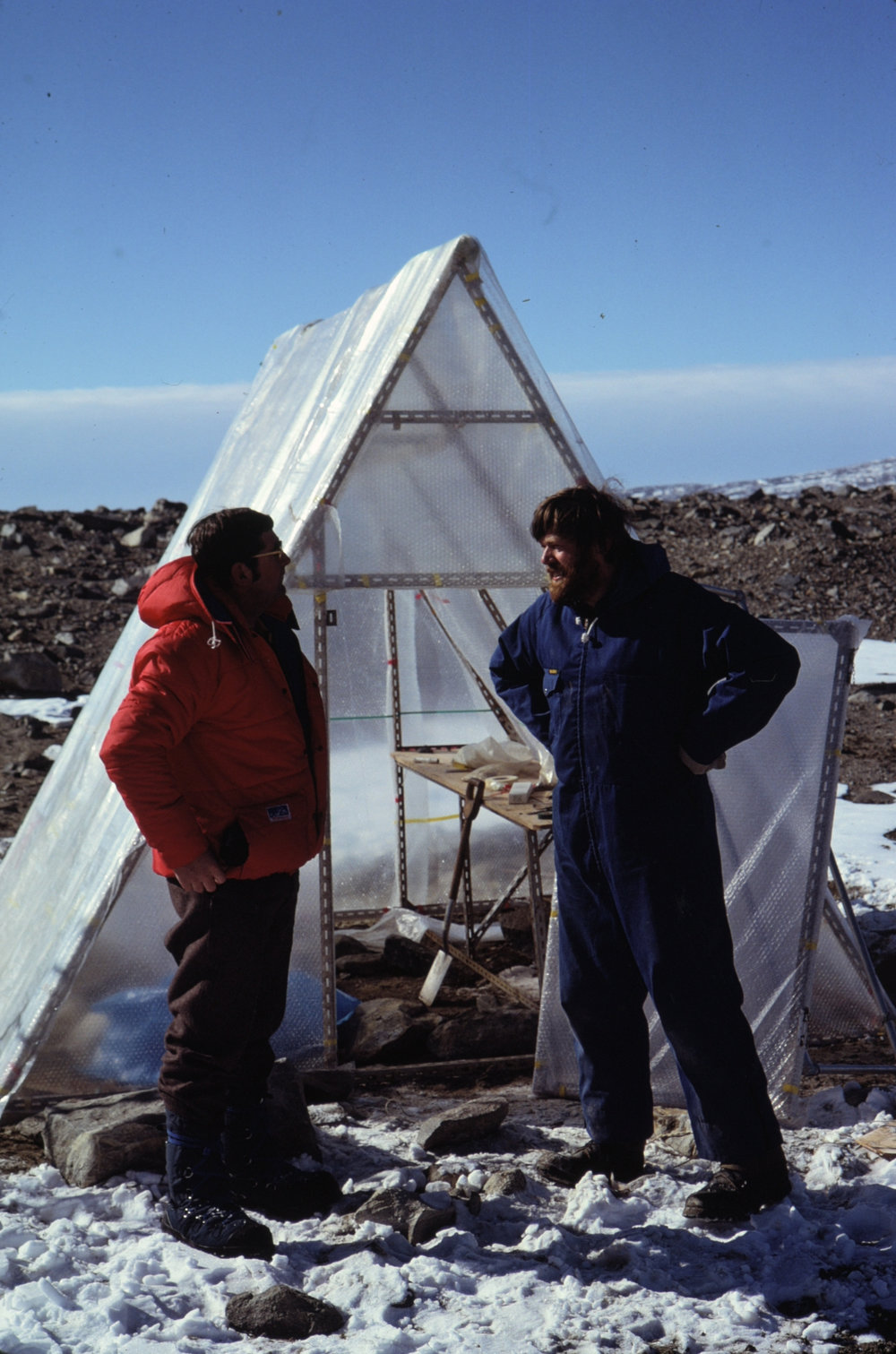 Barry Brill, Parliamentary Under-Secretary to the Minister of Energy, Science and Technology, outside the greenhouse at Lake Fryxell with Allan Green. Antarctica NZ, accessed 02/04/2026, https://adam.antarcticanz.govt.nz/nodes/view/24149