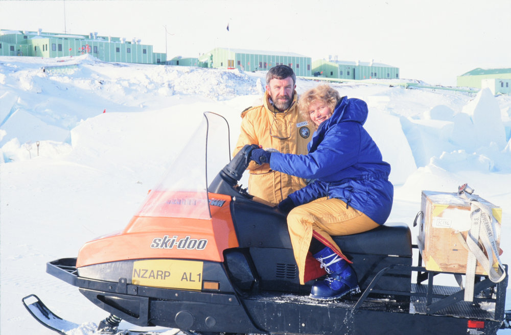 Christchurch Mayor, Vicki Buck, and Senior NZ representative David Geddes with a skidoo in front of Scott Base. Antarctica NZ, accessed 01/04/2026, https://adam.antarcticanz.govt.nz/nodes/view/24249