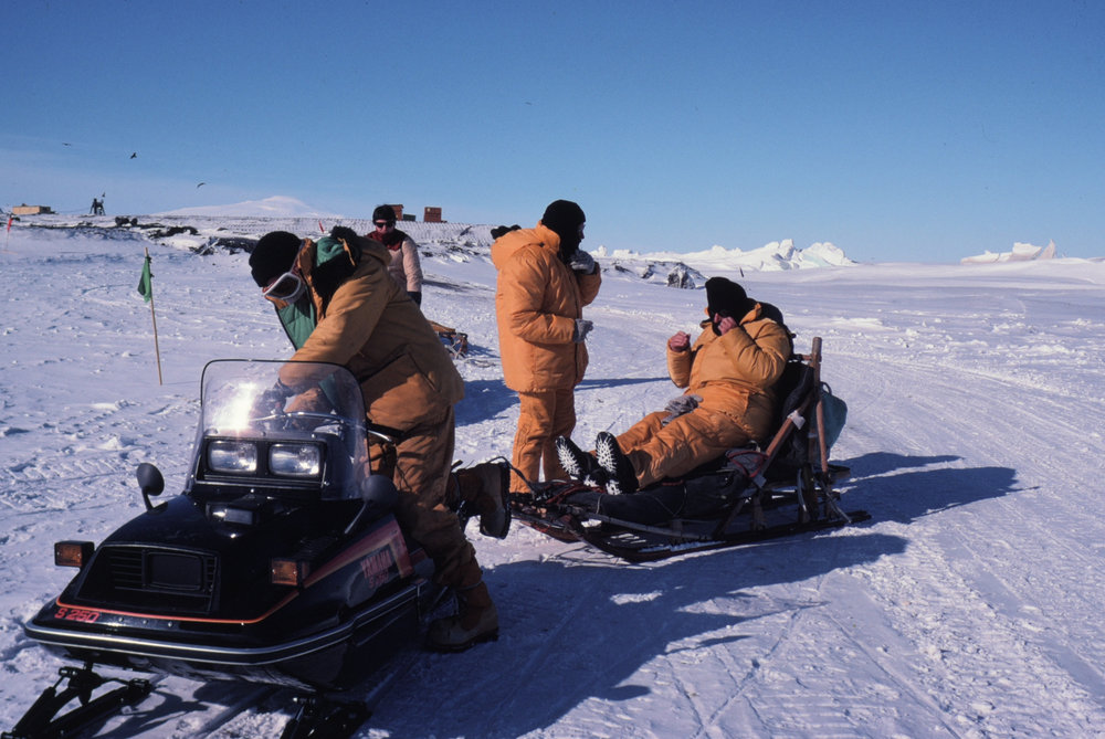 Governor-General Sir David Beattie riding a sled behind a Yamaha toboggan. Antarctica NZ, accessed 20/03/2026, https://adam.antarcticanz.govt.nz/nodes/view/24388