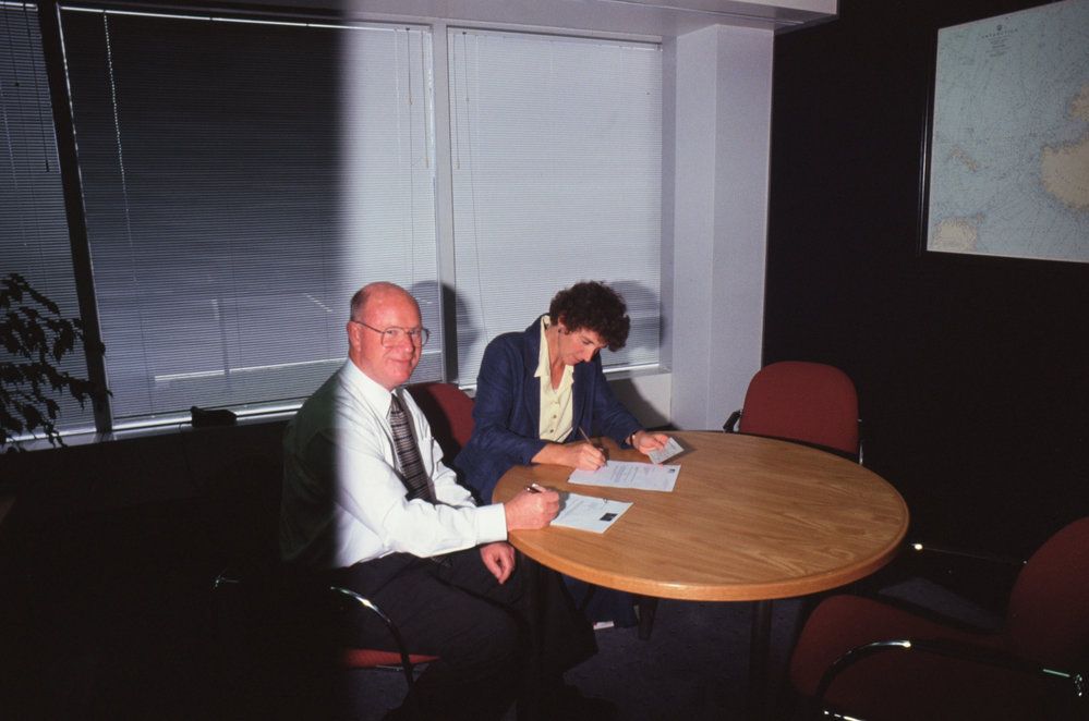 DescriptionExchange of Cheques Antarctica New Zealand and MFAT (Ministry of Foreign Affairs and Trade)DepictsGillian WrattPhotographerSteve AndrewsSeason1995-1996Date TakenBetween 1st September 1996 and 30th September 1996OriginalSlideNo. People2-5LocationChristchurchGeolocation[1] Position