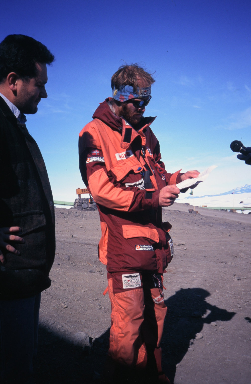DescriptionBørge Ousland meeting with media post-solo expeditionDepictsBørge OuslandPhotographerRob OrchistonSeason1996-1997Date Taken1996-1997 SeasonOriginalSlideNo. People2-5LocationScott BaseGeolocation[1] Position