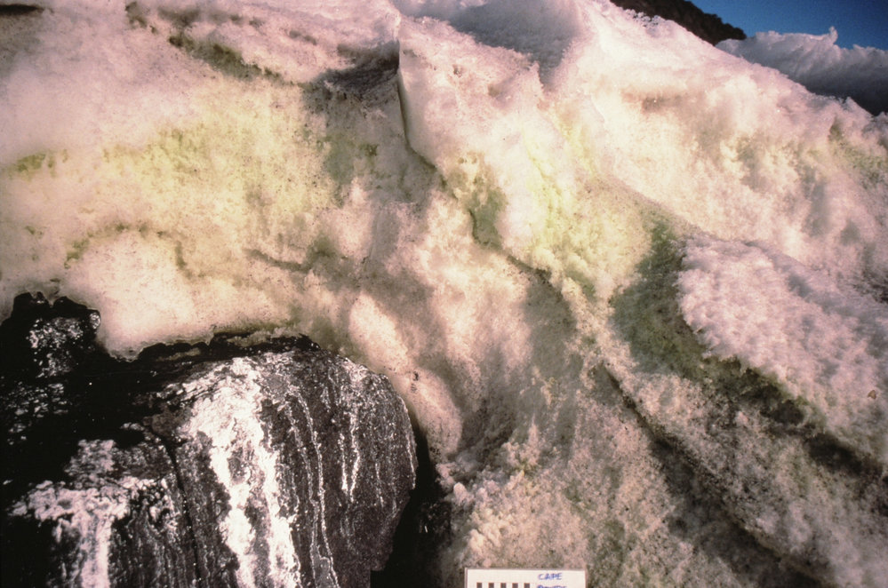 DescriptionGreen Snow Algae in Coastal Snow Drift Near to Penguin Colony at Cape Royds.PhotographerPaul BroadyProgrammeK053EventK053-8485Season1984-1985Date Taken1984-1985 SeasonOriginalSlideLocationCape RoydsGeolocation[1] Position