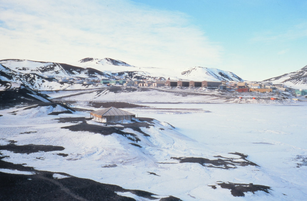 DescriptionDiscovery Hut in Foreground - Hut PointPhotographerChris ArcusProgrammeK391EventK391-0102-CSeason2001-2002Date Taken2001-2002 SeasonOriginalSlideLocationHut PointGeolocation[1] Position