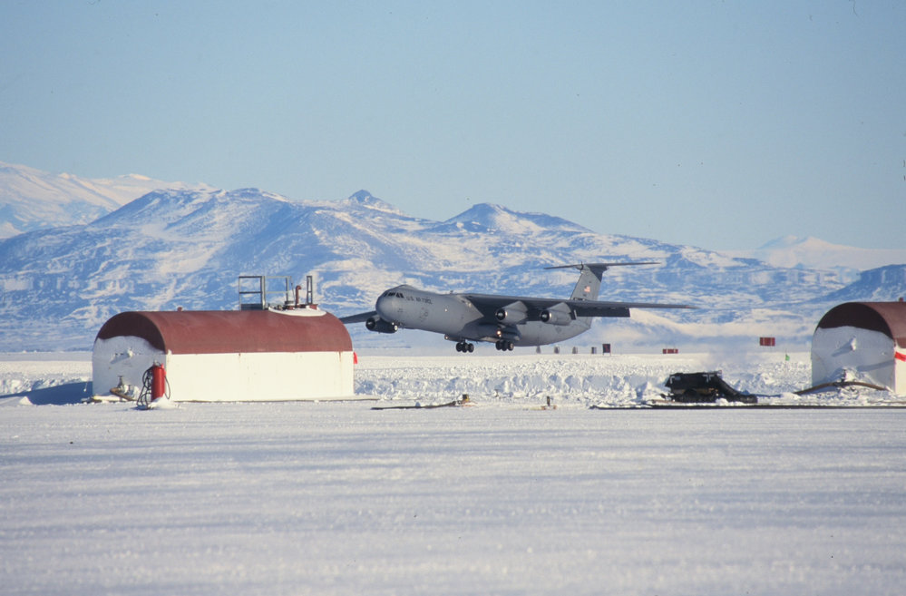 DescriptionLockheed C141B Starlifter Coming in to Land on Ice Runway.PhotographerS ScottSeason1994-1995Date Taken1994-1995 SeasonOriginalSlideLocationIce Runway