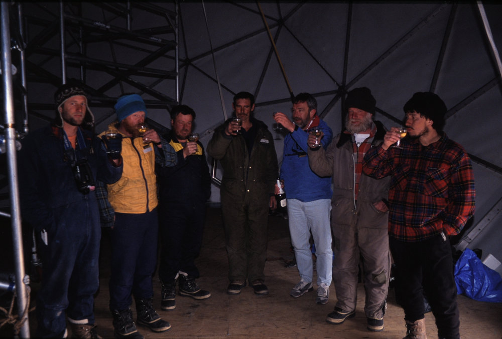 DescriptionConstruction team celebrating inside the completed SES domeSeason1991-1992Date Taken1991-1992 SeasonOriginalSlideNo. People5-10LocationArrival HeightsGeolocation[1] Position