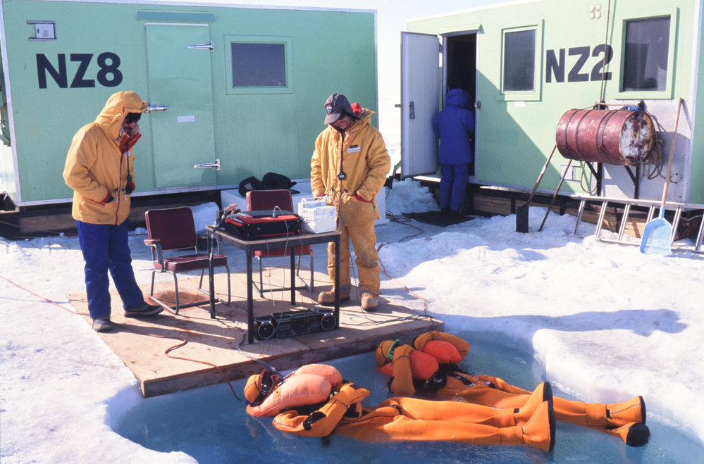 DescriptionQuick Don Immersion Suit TrialsPhotographerKevin RandlesSeason1992-1993Date TakenBetween 1st December 1992 and 31st December 1992OriginalSlideNo. People2-5
