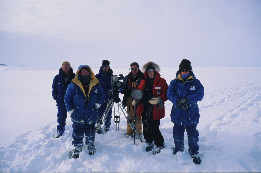 Artists in Antarctica Programme, L-R Tim Higham, Chris Orsman, Bill Manhire, camera crew, Nigel Brown. Antarctica NZ, accessed 01/04/2026, https://adam.antarcticanz.govt.nz/nodes/view/27077