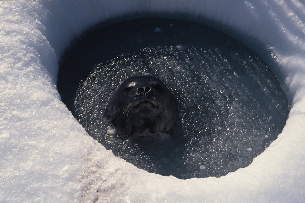 Seal coming up through an ice hole.