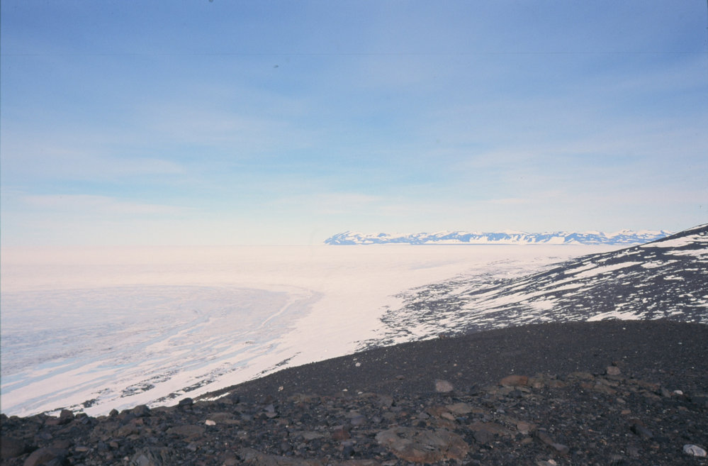 DescriptionView from the Top of Scallop Hill, Black island. Ross Ice Shelf to the left and Minna Bluff to the rightPhotographerKeith RobertsProgrammeK402EventK402-0102OriginalSlideLocationScallop HillGeolocation[1] Position