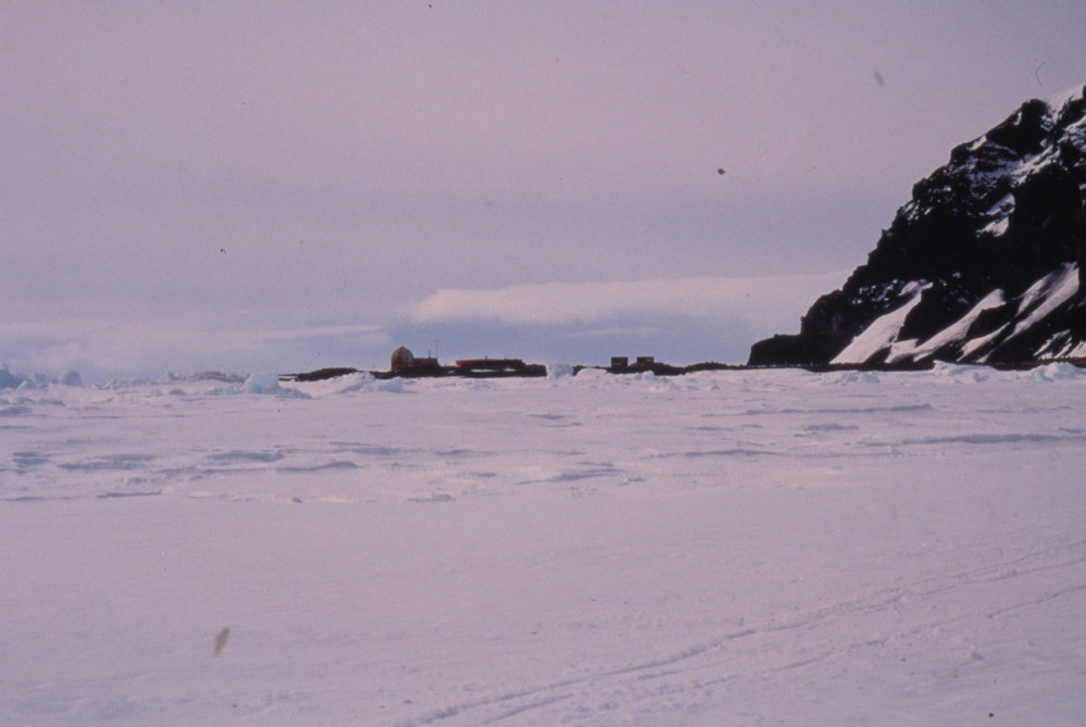 DescriptionHallett Station seen from sea icePhotographerR RogersSeason1994-1995Date TakenBetween 1st December 1994 and 31st December 1994OriginalSlideLocationCape HallettGeolocation[1] Position