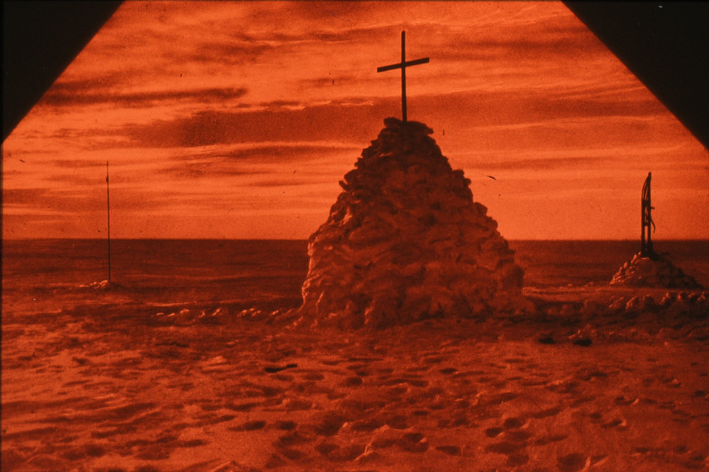 DescriptionCairn Over Bodies of Scott, Bowers and Wilson, built after their discovery by the rescue party. 1914PhotographerHerbert PontingOriginalSlideLocationPolar PlateauGeolocation[1] Position