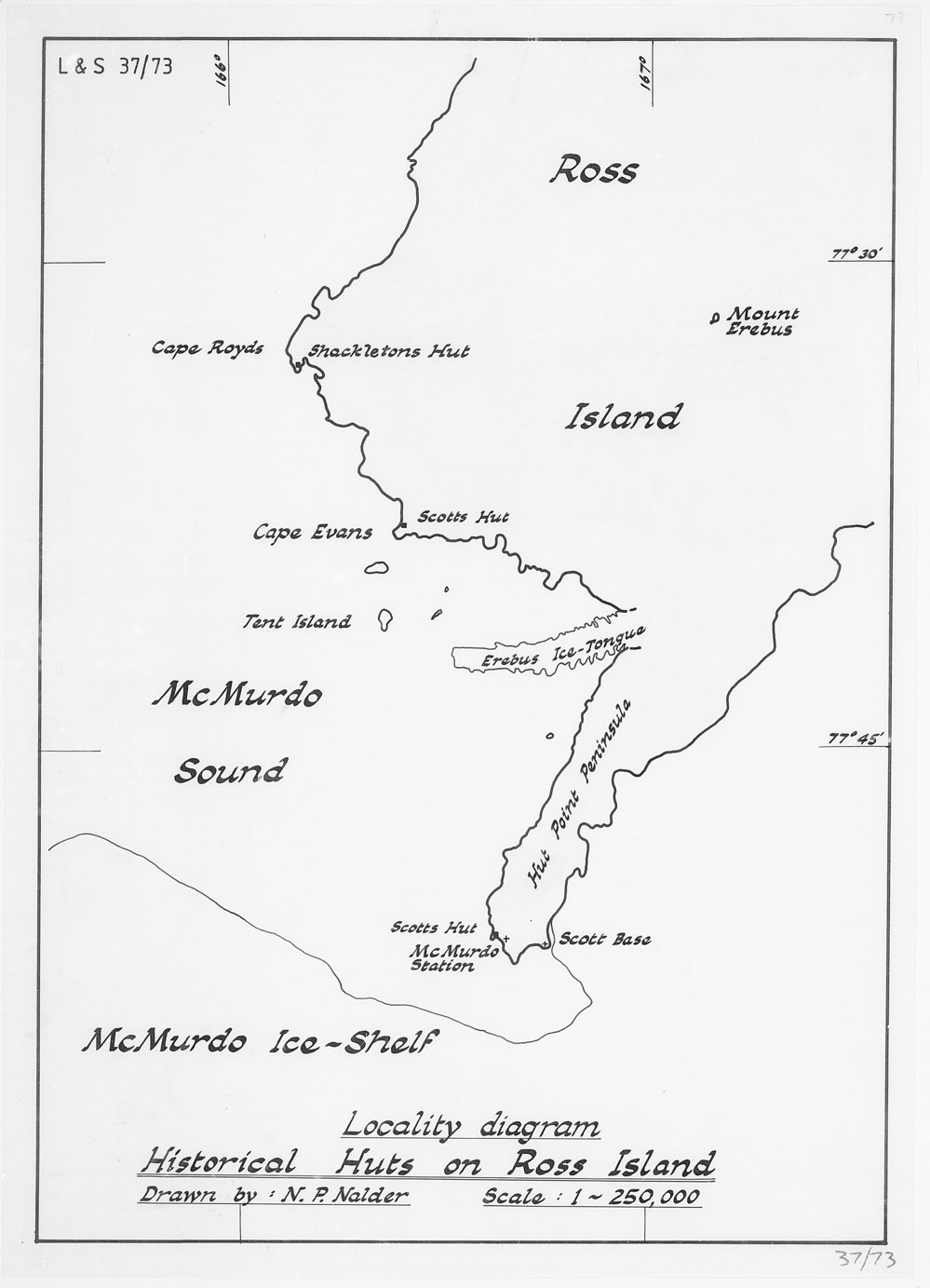 DescriptionLocality diagram - Historical Huts on Ross IslandPhotographerN.P. NalderSeason1977-1978Date Taken1977-1978 SeasonOriginalApeture CardsLocationRoss Island