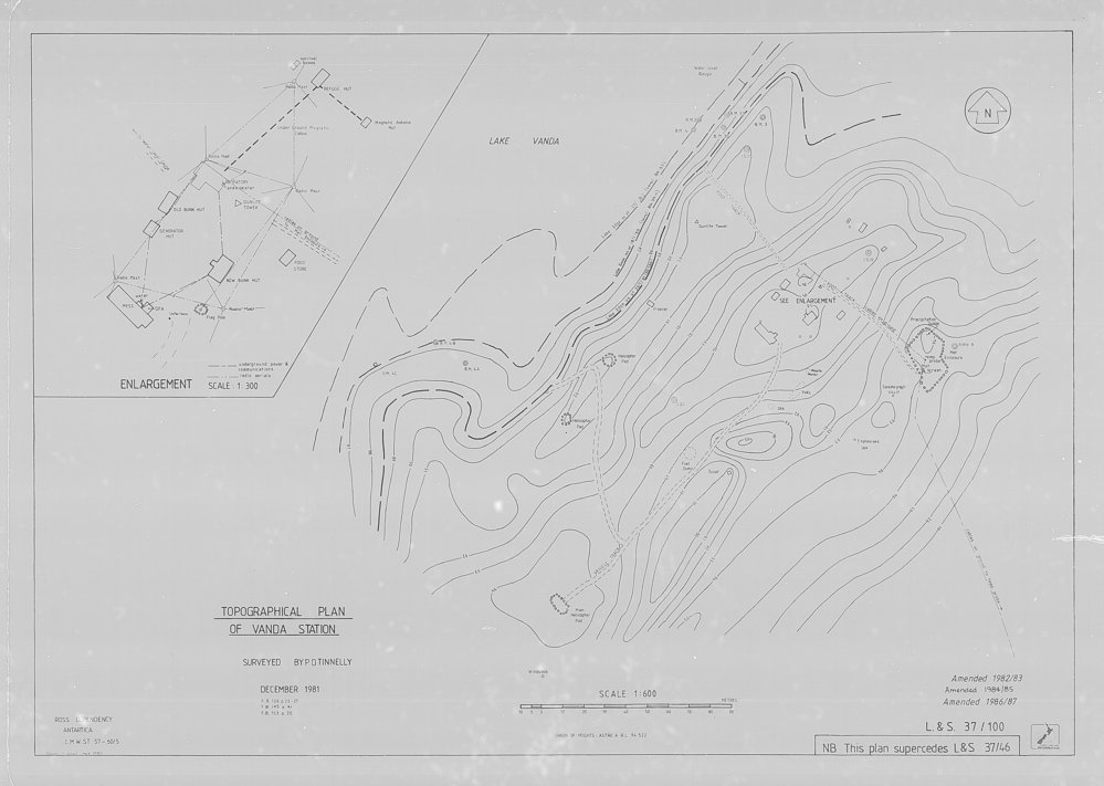DescriptionTopographical Plan of Vanda Station with enlargement (top left)PhotographerP D TinnellySeason1981-1982Date Taken1981-1982 SeasonOriginalApeture CardsLocationVanda Station