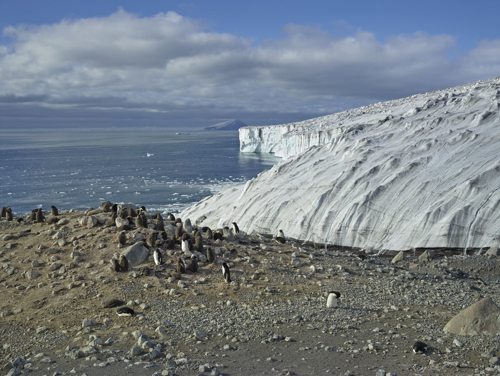 Adelie Penguins at Cape Bird with the Cape Bird Ice cap in the background