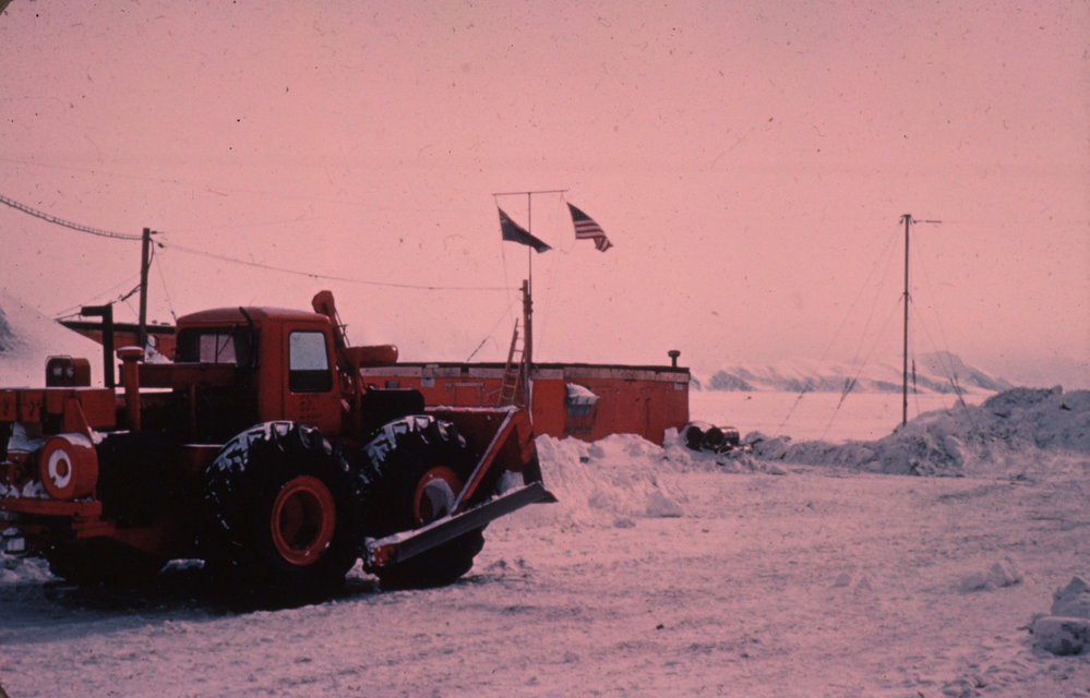 DescriptionVehicle and recreation hut at Cape HallettPhotographerJ W BeagleySeason1956-1957Date Taken1956-1957 SeasonOriginalSlideLocationCape HallettGeolocation[1] Position