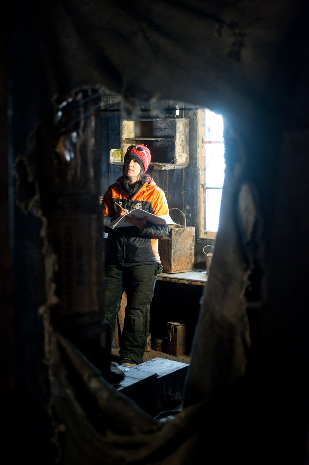 AHT Conservator, Lizzie Meek, at work in Discovery Hut, Hut Point