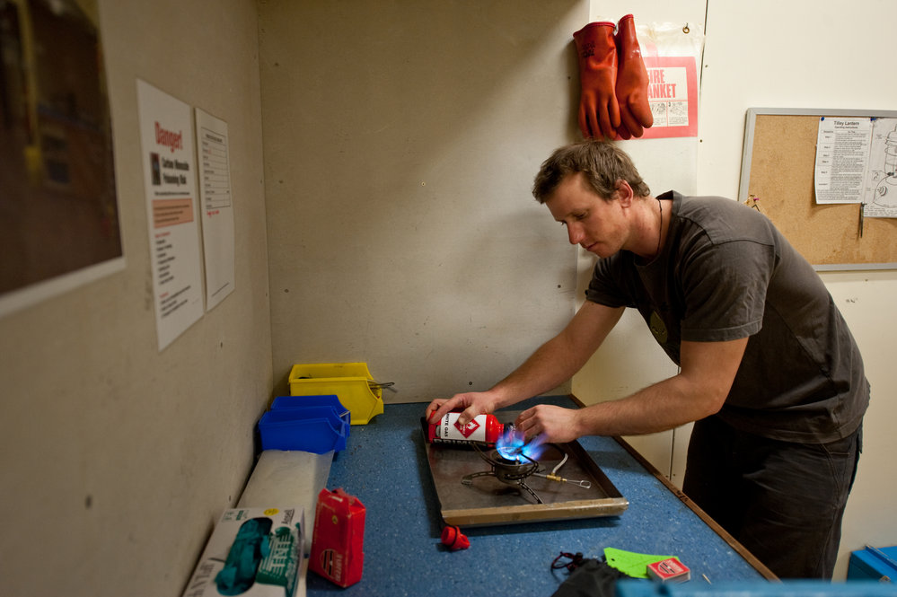 Field Support, Mike Rowe, tests an emergency stove