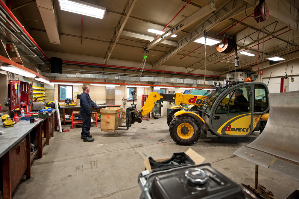 Moving spare parts around with the telehandler in the mechanic's workshop