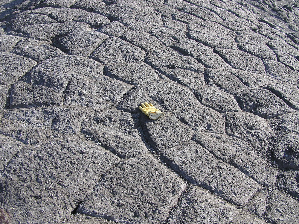 Yellow glove facing away from photographer, lying in middle of patterned grey lava