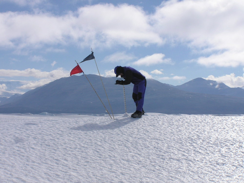 One red one black flag clearly visible. Hills and cloud in background. Excellent textured snow