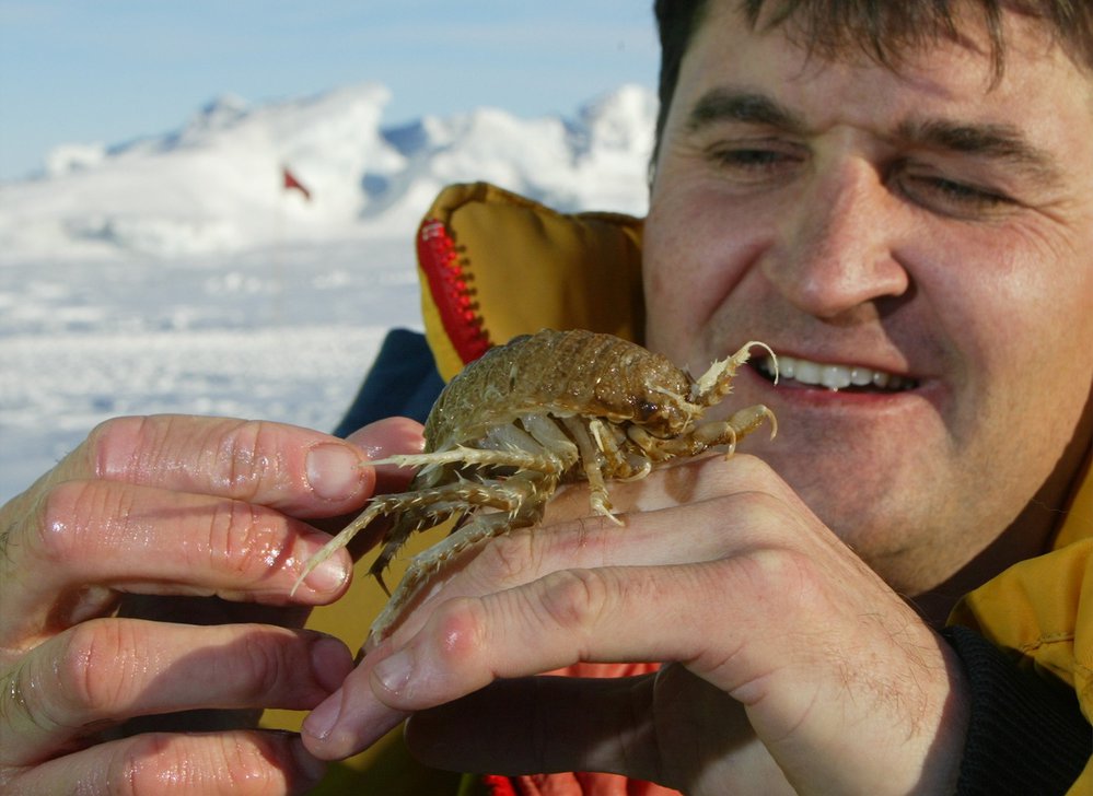 Miles Lamare with isopod on the back of his hand. Ice and red flag in background.