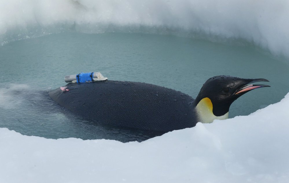 Emperor penguin floating in ice hole