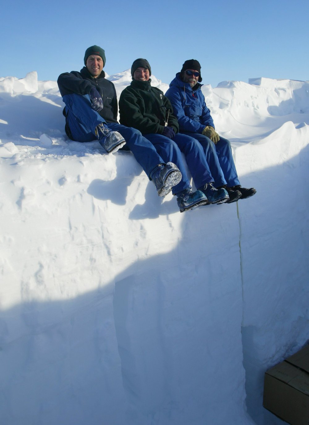 3 people sitting on edge of an ice wall. Some kind of wooden thing on bottom right.