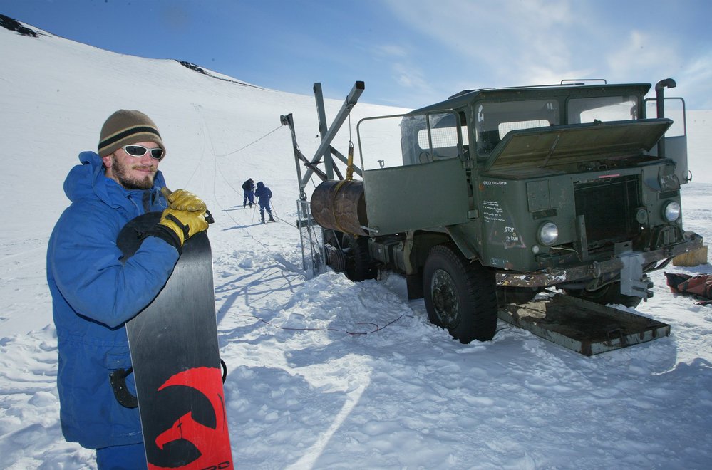close up of snowboarder looking smug by vehicle running ski field rope tow.