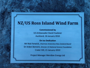 Plaque for the Ross Island wind farm, unveiled 21 January 2010