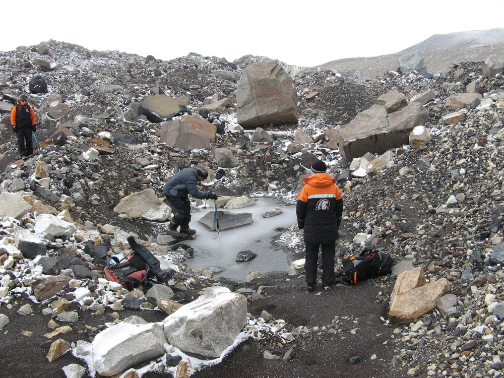 Sampling of water and sediment at pond on ice cor moraine near Koettlitz Glacier. A hole had to be made using an ice axe in order to carry out sampling.. Antarctica NZ, accessed 16/04/2026, https://adam.antarcticanz.govt.nz/nodes/view/29249