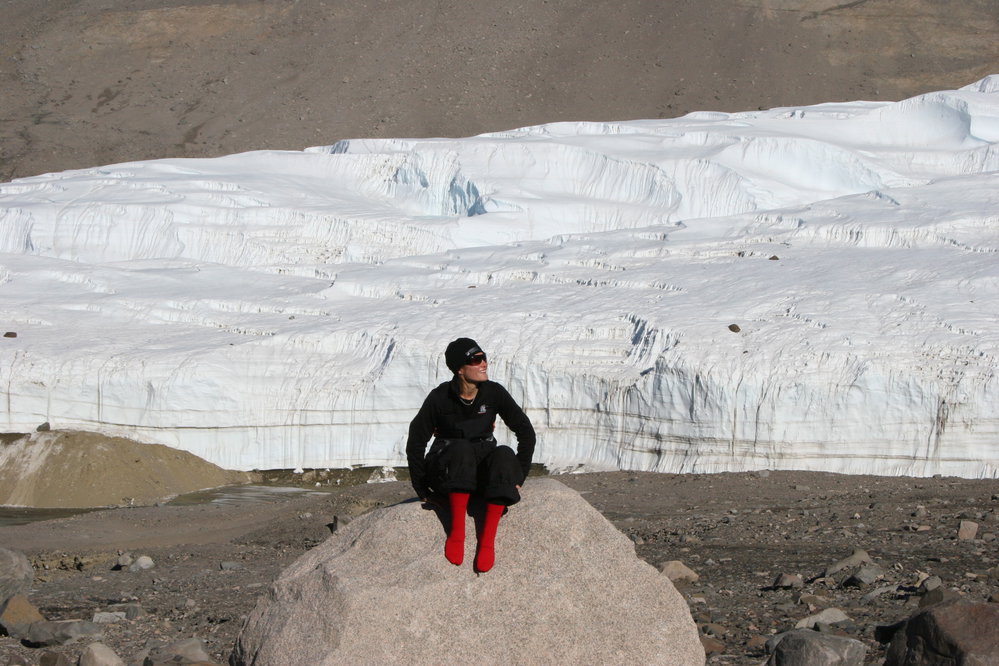 Natalie, Antarctic Youth Ambassador, showing off her lucky red socks at the Taylor Glacier. Antarctica NZ, accessed 24/03/2026, https://adam.antarcticanz.govt.nz/nodes/view/29276