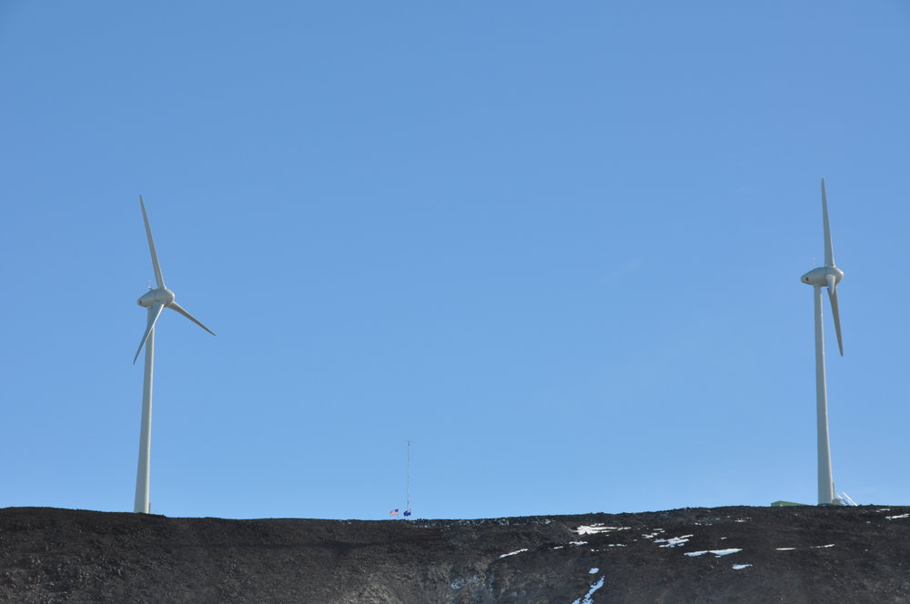 Wind turbines on the skyline, with the US & NZ flags