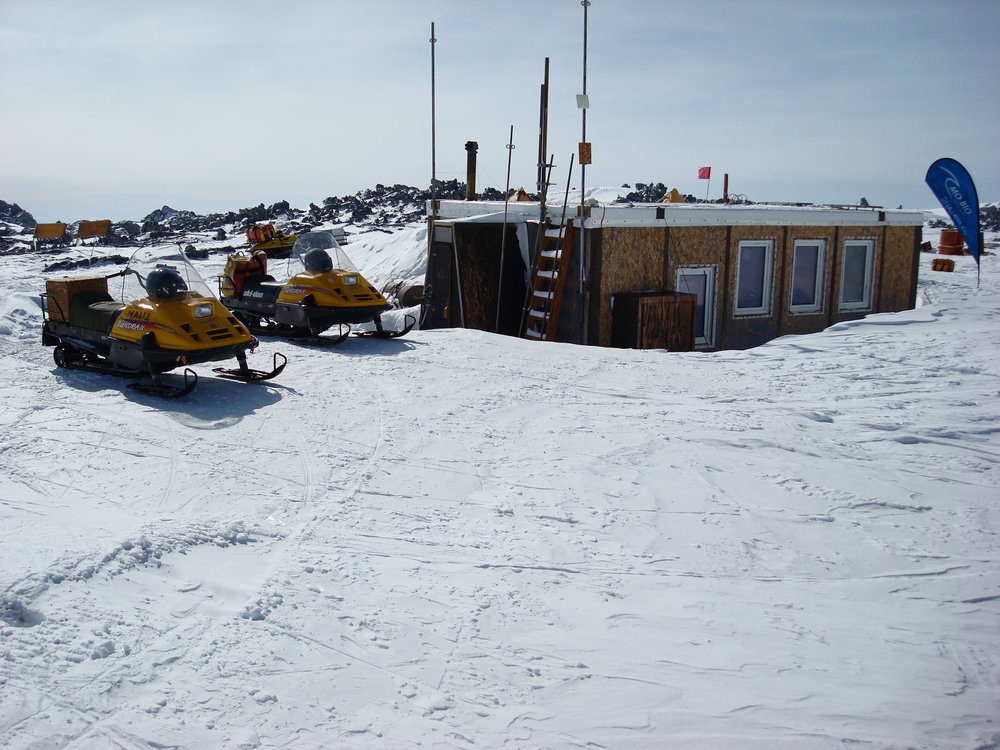 Lower Erebus hut with skidoos in foreground