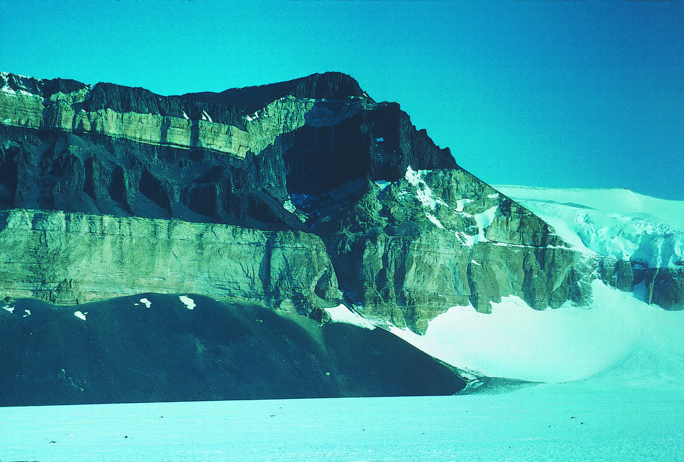 Dark rock = Ferrar dolerite; light rock = Beacon sandstone