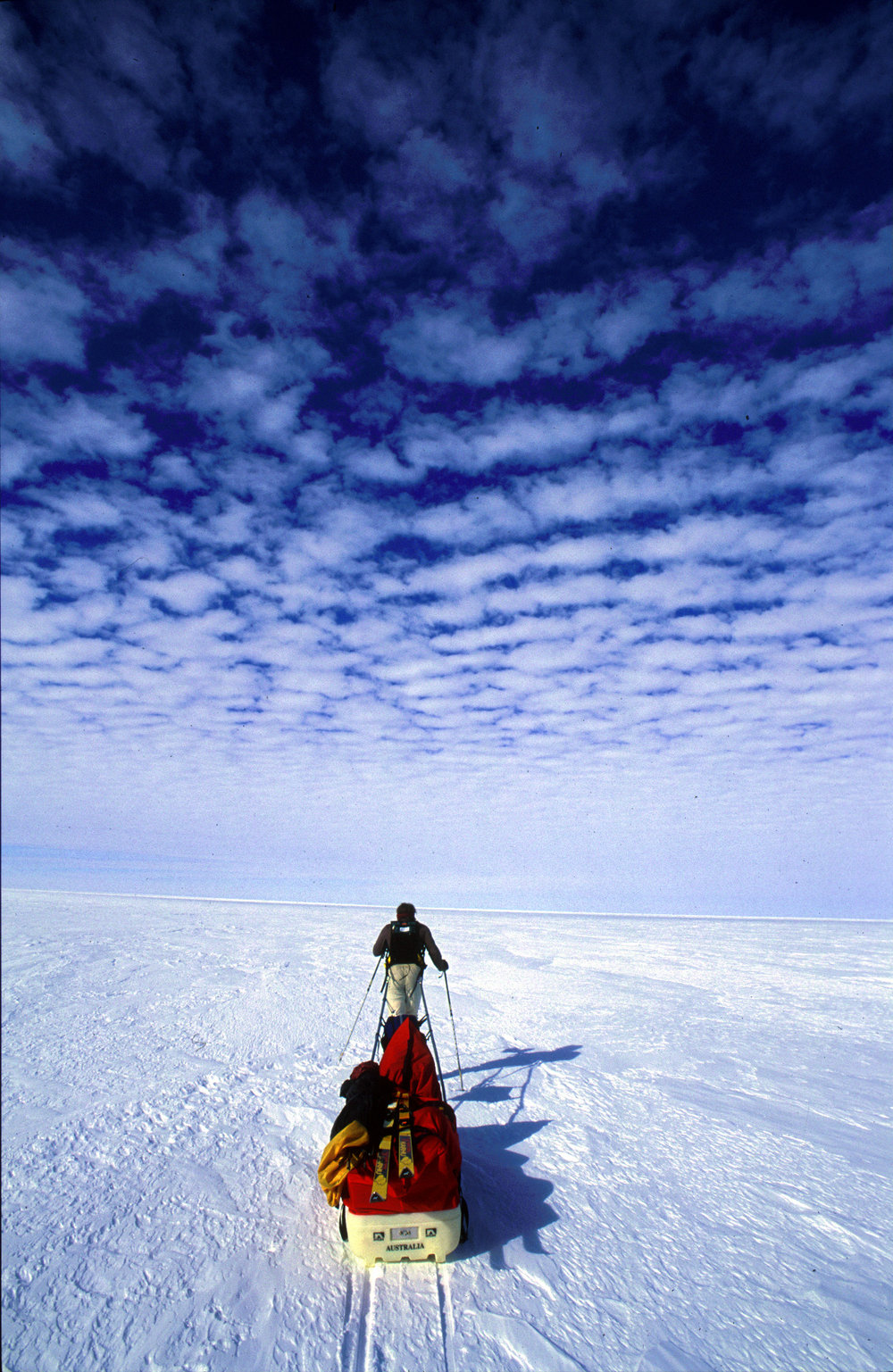 Jon Muir strides south under a mottled sky