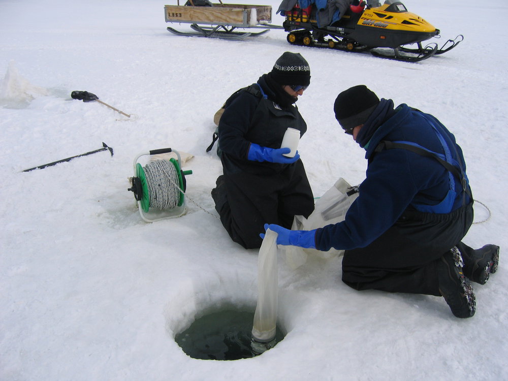 Kathy Ruggiero and Mary Sewell sampling at the plankton hole