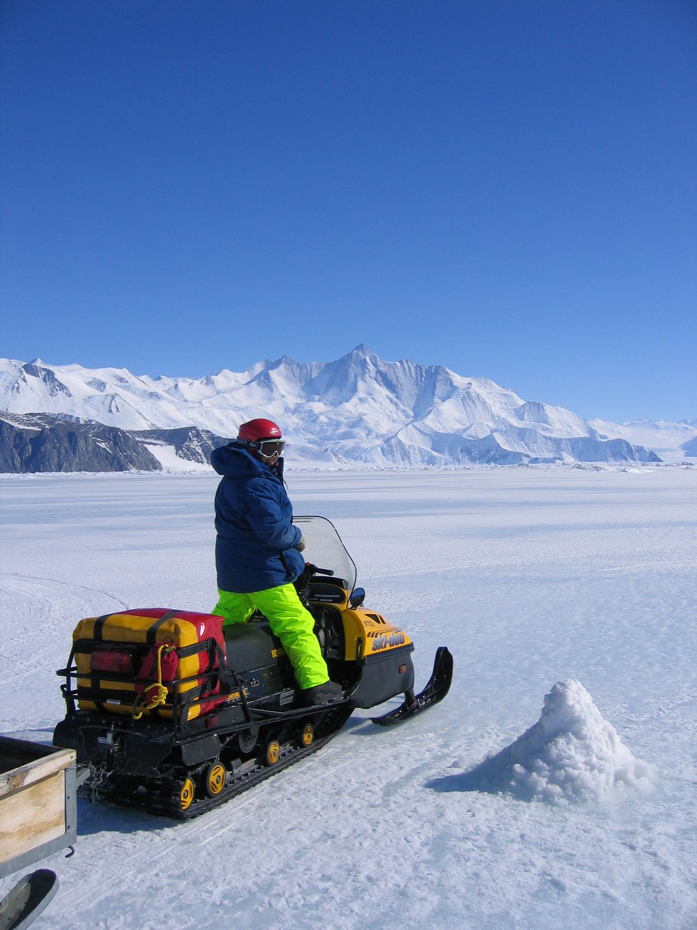 Kathy Ruggiero driving a skidoo home from the plankton hole