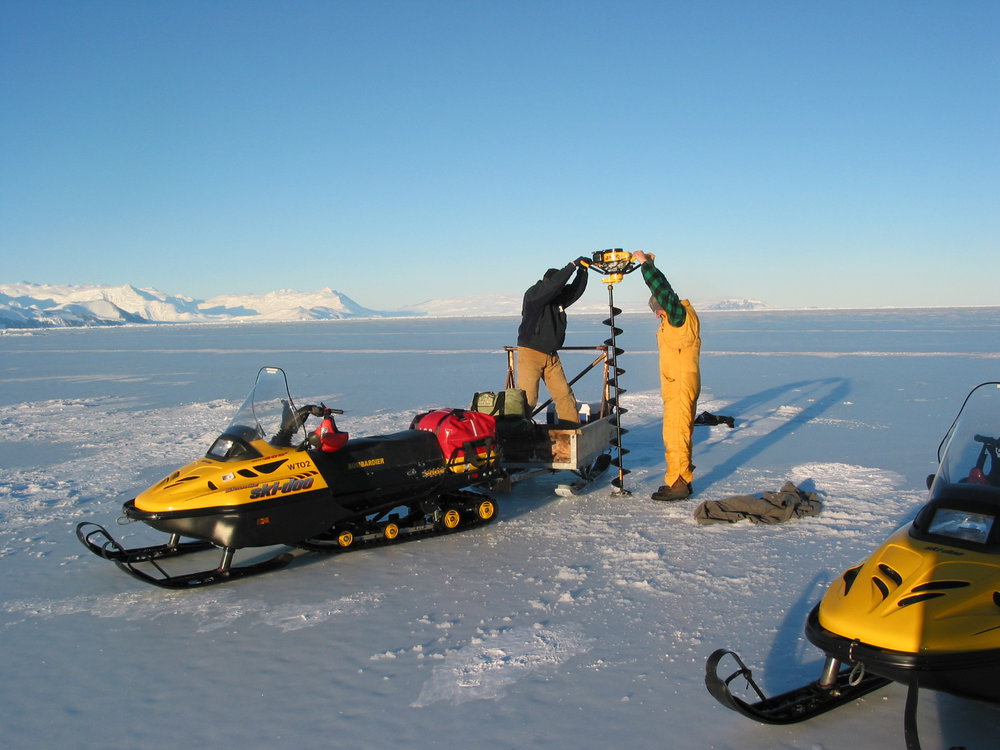 Drilling a hole through the sea ice with a jiffy drill