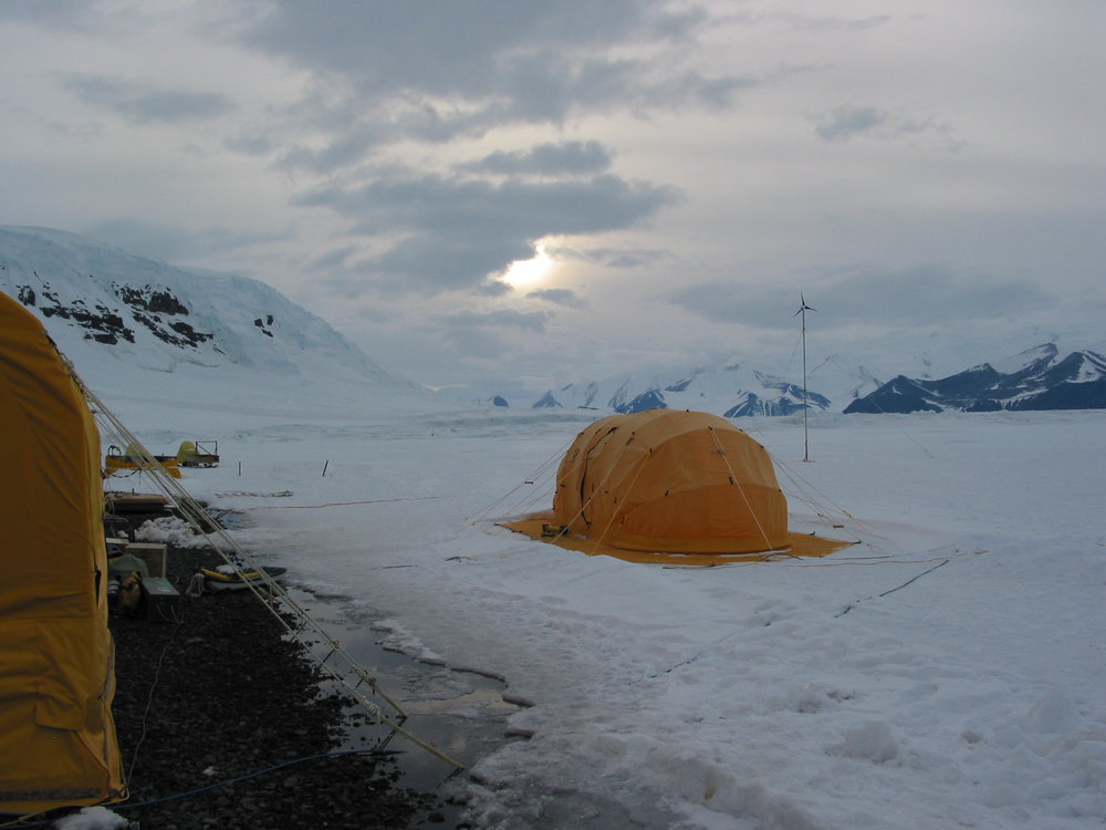 Sunset at Cape Hallett with Endura tent used as a laboratory