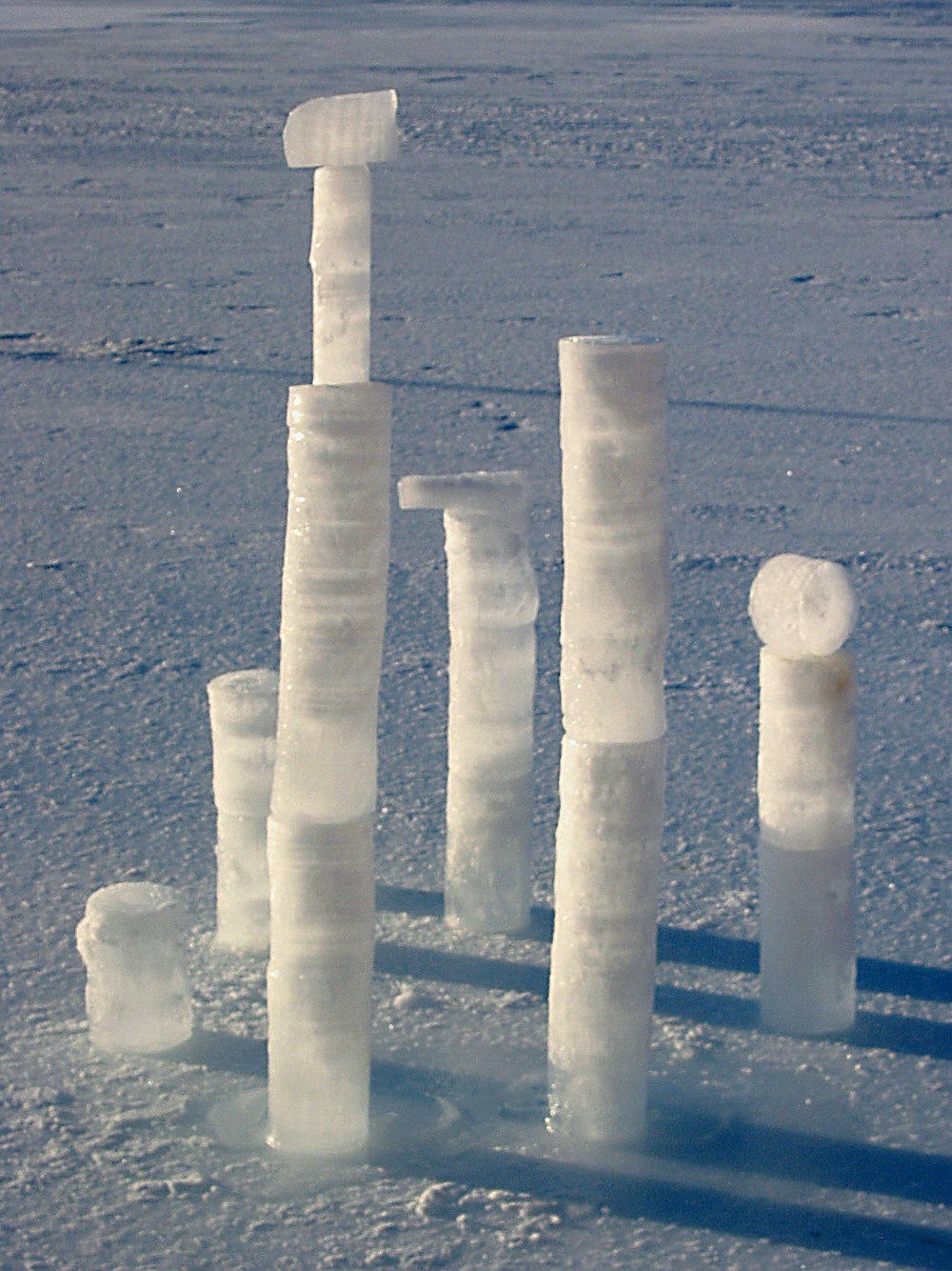 "artist's statement": The stark contradictions of sophisticated cosmopolitan landscapes and a remote Antarctic field site are evocatively captured in this striking image. The juxtaposition of shapes and form encapsulate the anomalies of city architecture, at once reminiscent of skyscrapers and yet more deeply reflecting the artist's rejection of the modern trappings of metropolitan life. The sheer simplicity of the ice core sculpture symbolises the grandeur of the Antarctic panorama, yet the melt puddle at the base of the work reflects the transient nature of city skyscrapers and contradicts the timelessness of the Antarctic environment