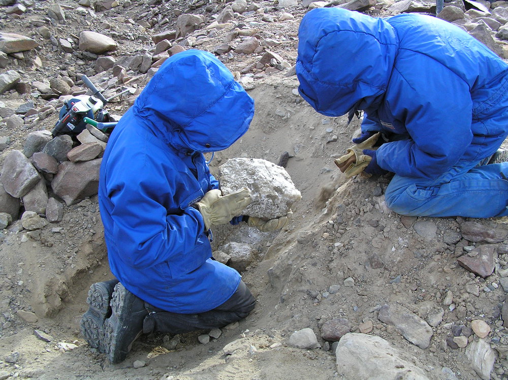 Leigh Hyland and Warren Dickinson prepare to wrap a block of relict ice which has been excavated from Beacon Valley. Antarctica NZ, accessed 13/04/2026, https://adam.antarcticanz.govt.nz/nodes/view/30134