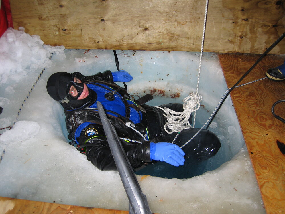 Brian Grant exiting the dive hole at Cape Evans