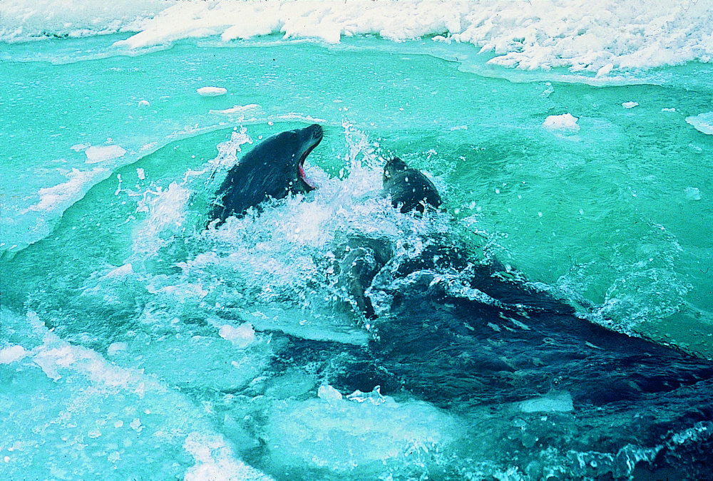 Two Weddell seals splashing in a hole in ice