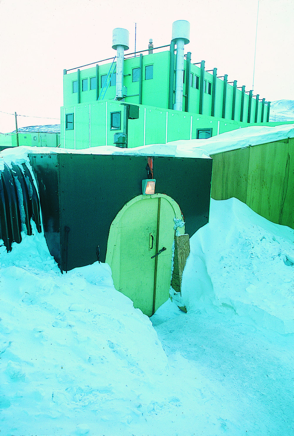 New Scott Base "Q" hut looms over old: main entrance